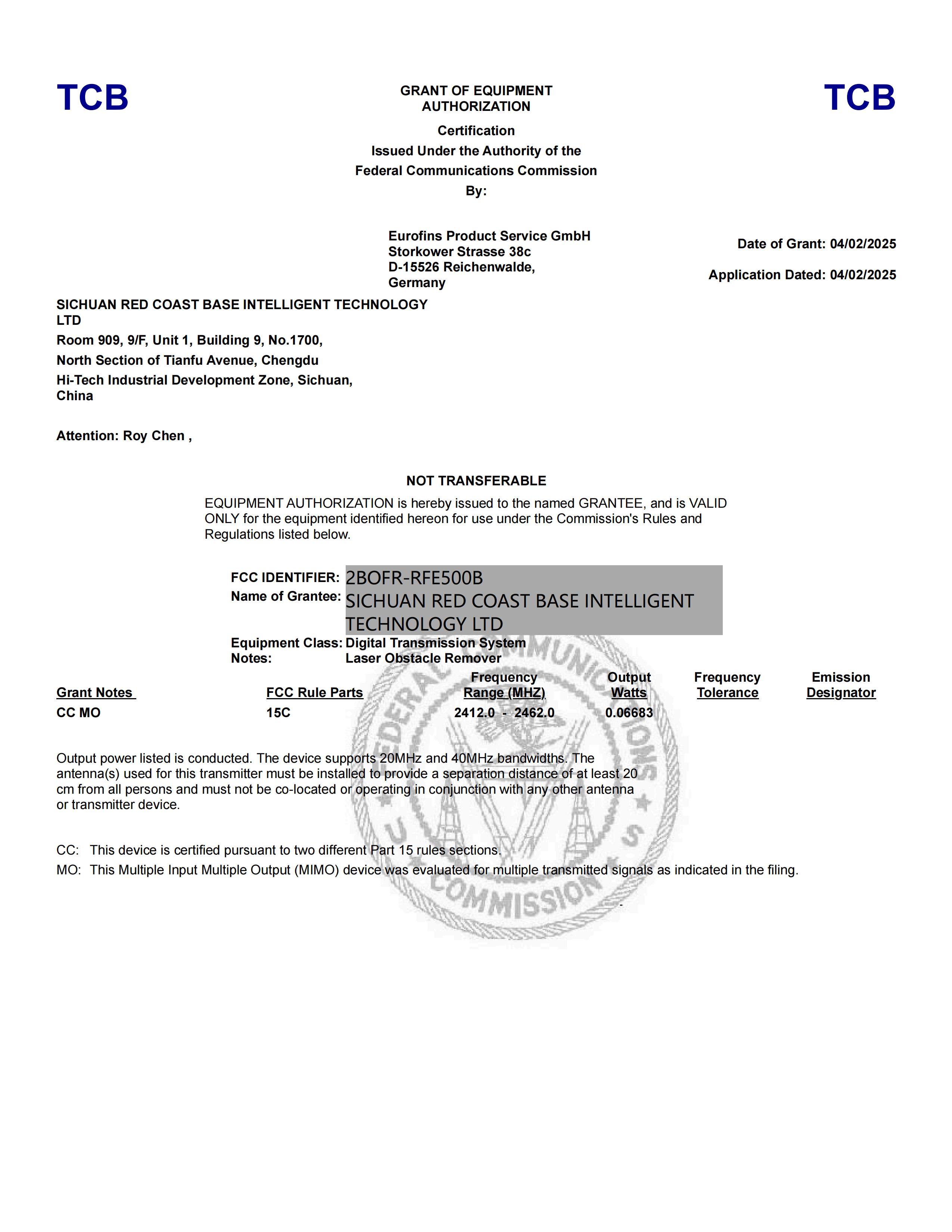 RedCoast Laser a obtenu la certification FCC